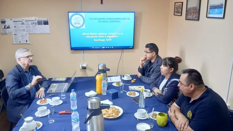 A visita iniciou com uma reunião na tarde do dia 27, que contou com a participação dos pastores Gerardo Kinas e Pablo Gonzáles, respectivamente presidente e vice-presidente da IELCC, do Pastor Obed Coronado, Capelão do Colégio Luterano Concórdia de Valparaíso, e da Sra. Juana Fernández, Representante Legal das Escolas Luteranas do Chile. Esse momento foi dedicado à troca de informações sobre o trabalho das escolas do Chile e do Brasil e à divulgação do 1º Encontro Latino-americano de Escolas Luteranas (1º ELAEL), que ocorrerá em Restinga Sêca, RS, durante os dias 22 a 25 de julho de 2026.